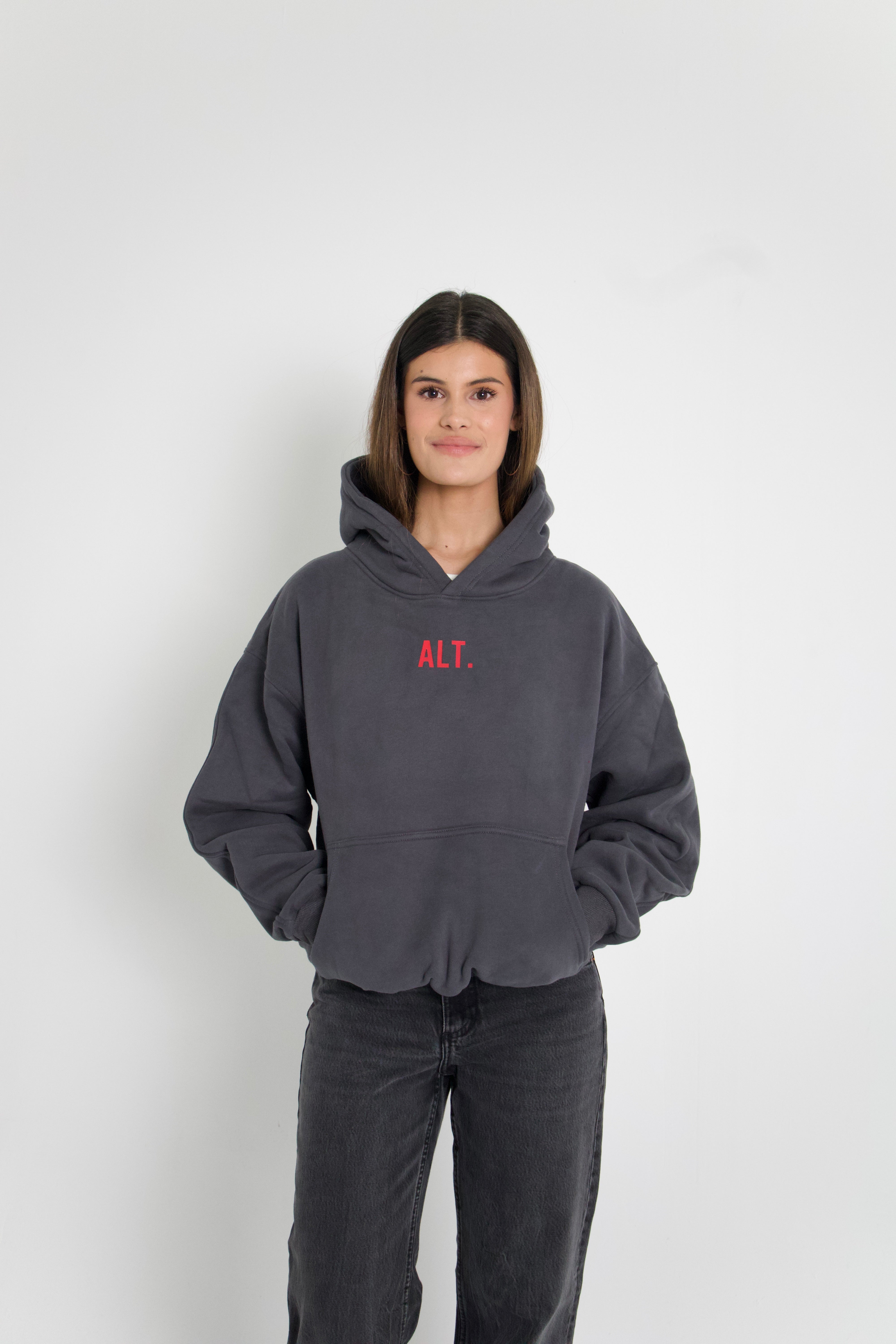 A soft cotton-blend fleece in dark grey, featuring a relaxed fit for with pink rhinestone design on the back.